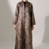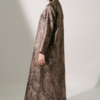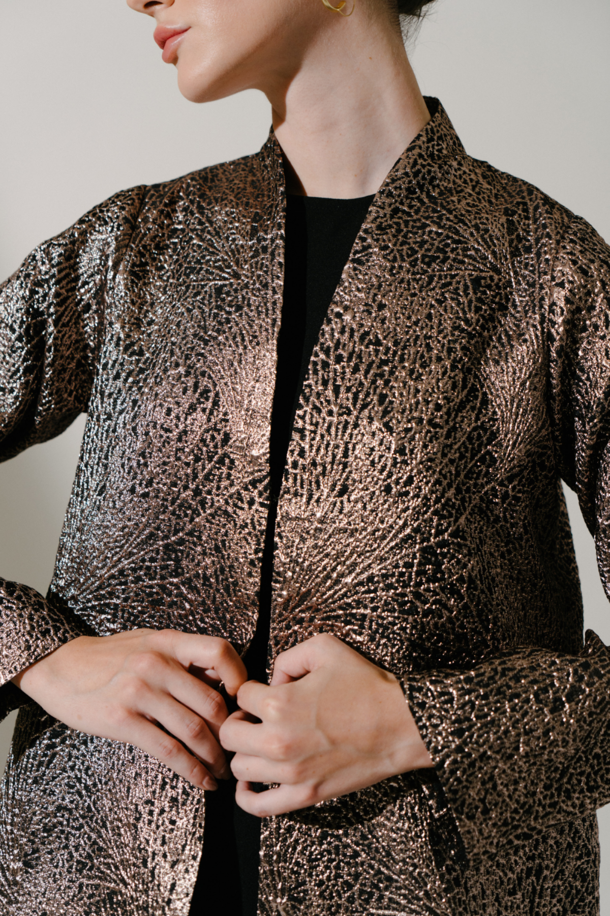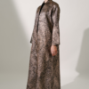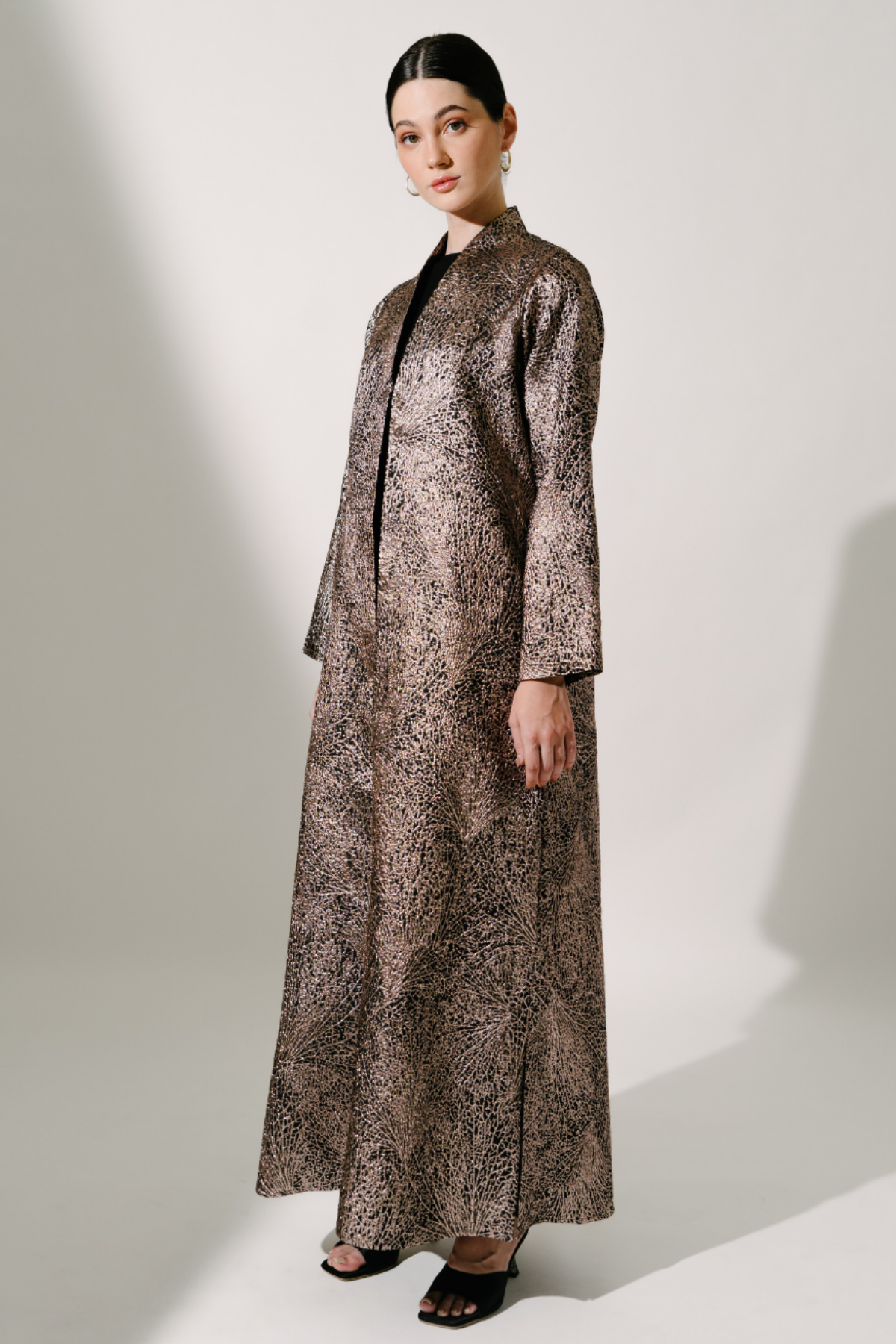The Aaliyah Coat in Black expresses modern sophistication through its textured jacquard surface and graceful elongated form. The subtle luminosity created by woven lurex threads enhances its refined presence, while the high neckline adds a sense of polished structure. Designed to complement formal ensembles, this piece offers a timeless interpretation of occasion wear with a contemporary edge. The rich dark gold tone further elevates its elegance, making it a distinguished addition to a luxury wardrobe.