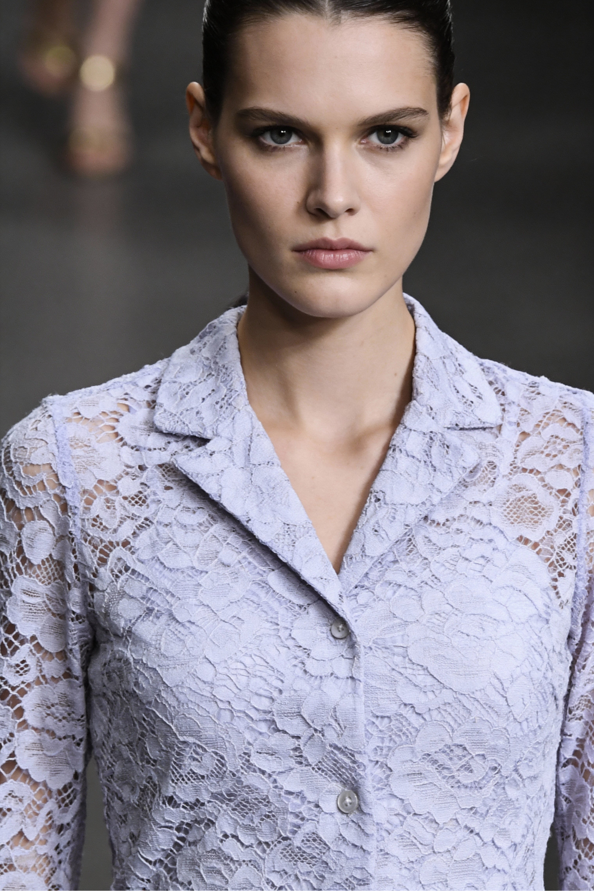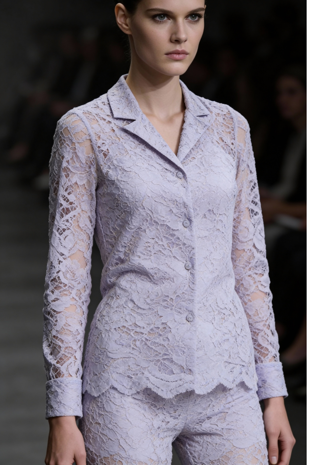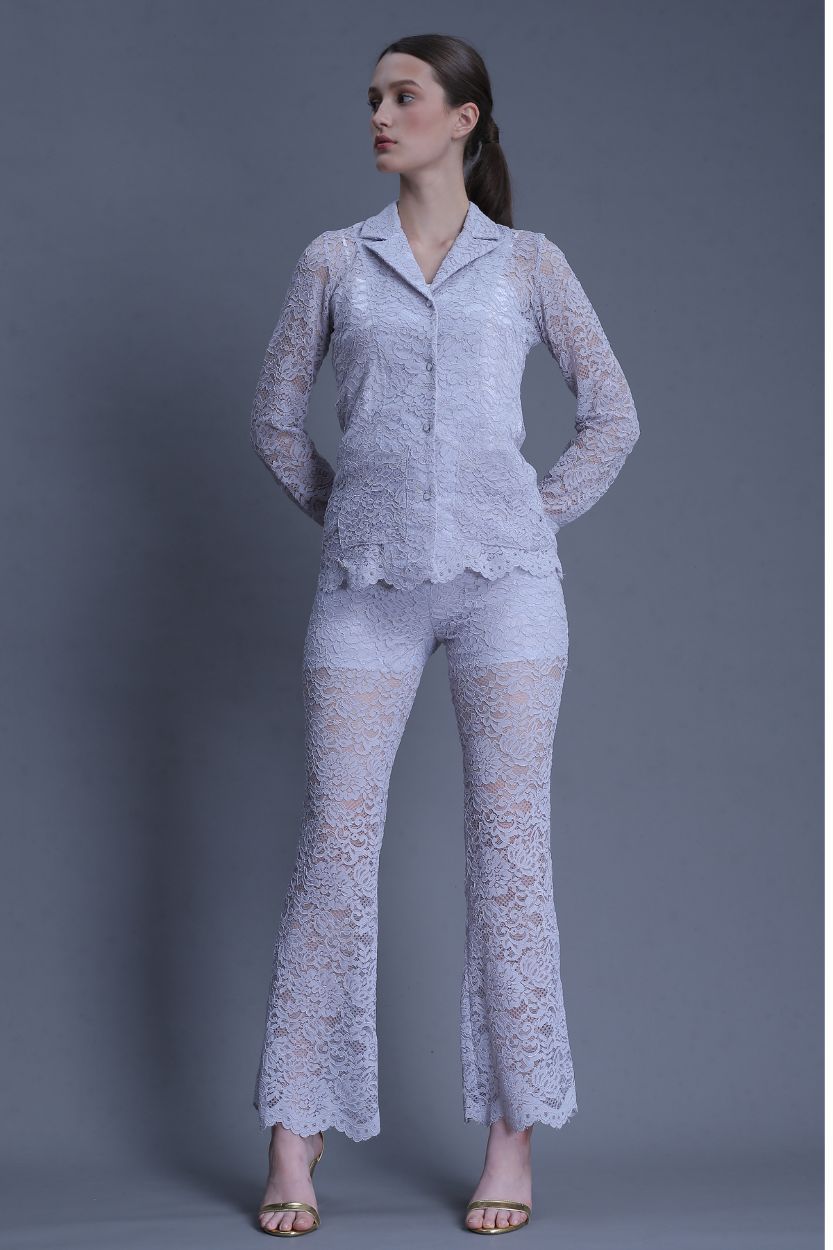 Demure Lace Set is crafted from embroidered cotton lace, blending delicate texture with tailored elegance. The fitted button-up top features a notched lapel collar and long sleeves, paired with high-waist flared trousers that elongate the silhouette.