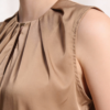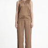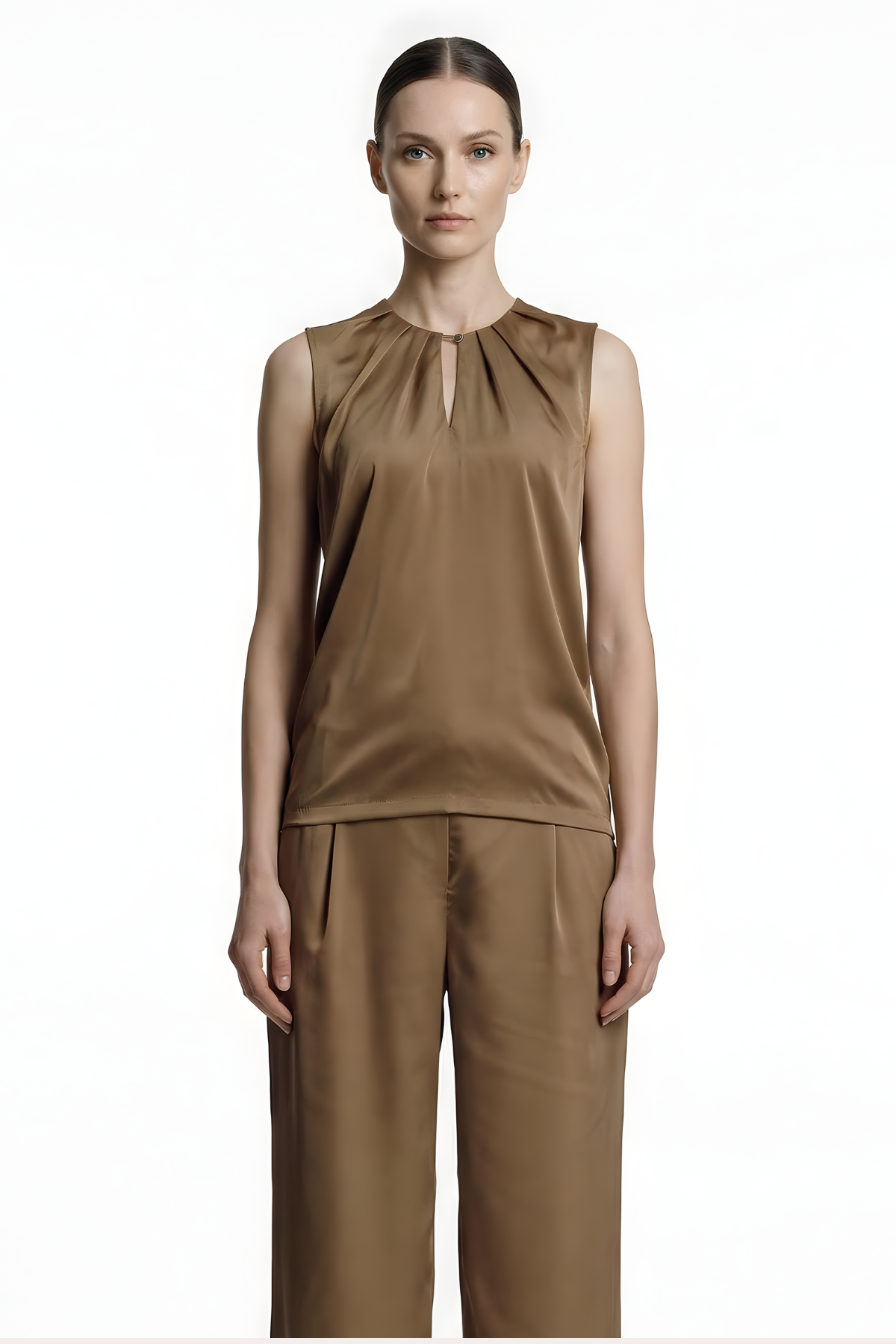 This refined ensemble showcases a sleeveless satin top with delicate gathers along the neckline, finished with a subtle keyhole detail for understated elegance. The fluid silhouette drapes effortlessly, paired with wide-leg satin trousers featuring soft front pleats for movement and ease. Designed with a minimalist sensibility, the set embodies modern sophistication and timeless versatility.